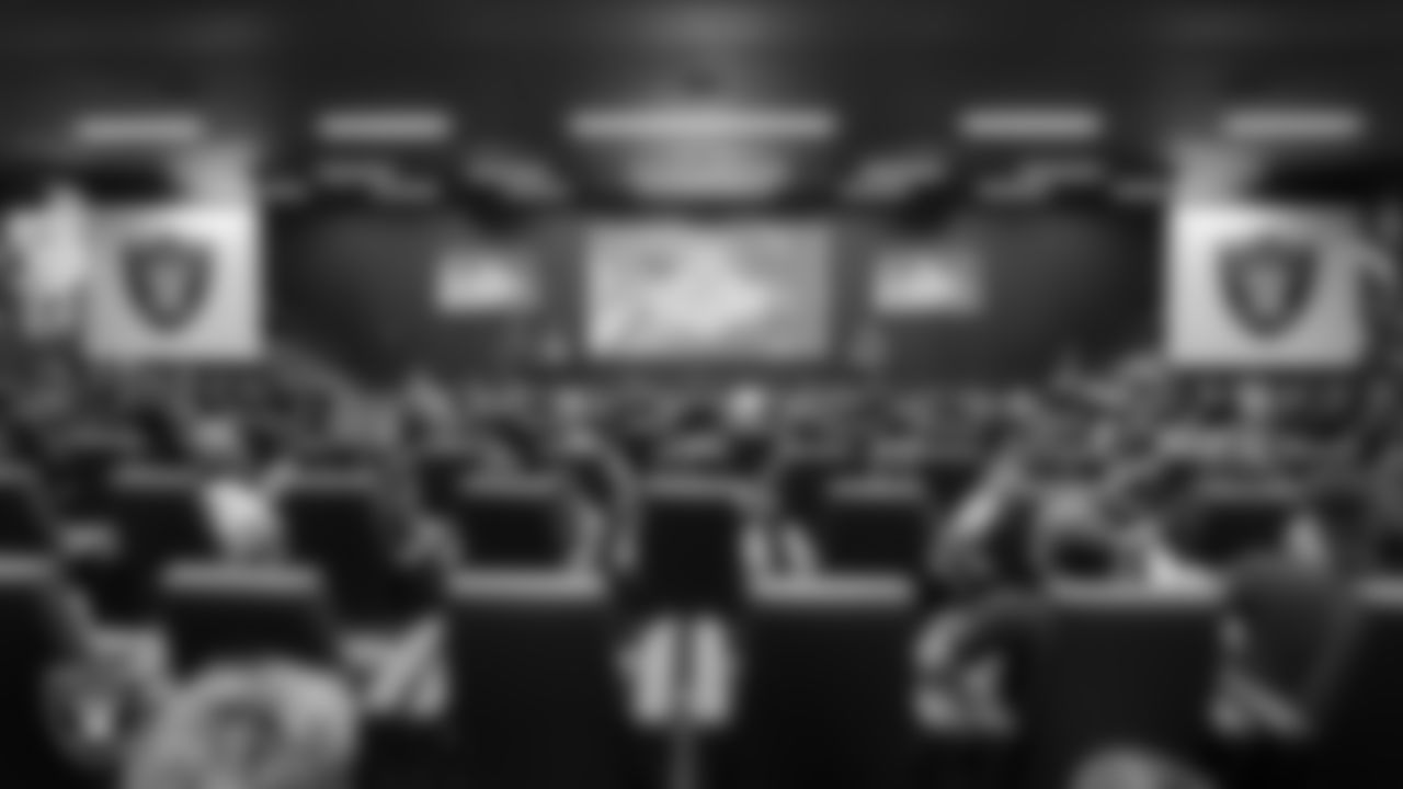 Las Vegas Raiders manager of football development Jordan Aguilar welcomes offensive and defensive linemen to Raiders ELITE Academy at Las Vegas Raiders Headquarters.