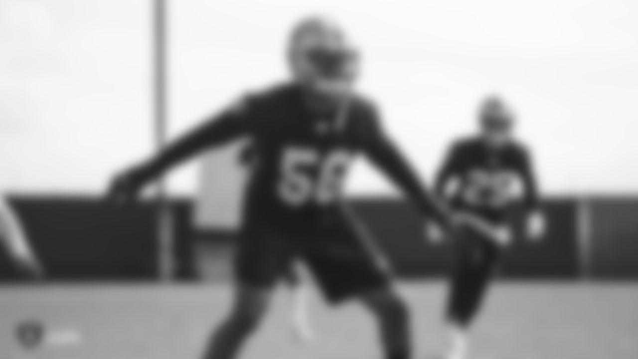 Oakland Raiders linebacker Tahir Whitehead (59), linebacker Derrick Johnson (56), and cornerback Gareon Conley (21)on the field for practice at The Oakland Raiders Practice Facility, Thursday, October 4, 2018, in Alameda, California.