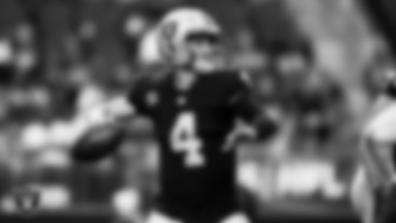 Las Vegas Raiders quarterback Derek Carr (4) looks for a receiver during the regular season home game against the Chicago Bears.