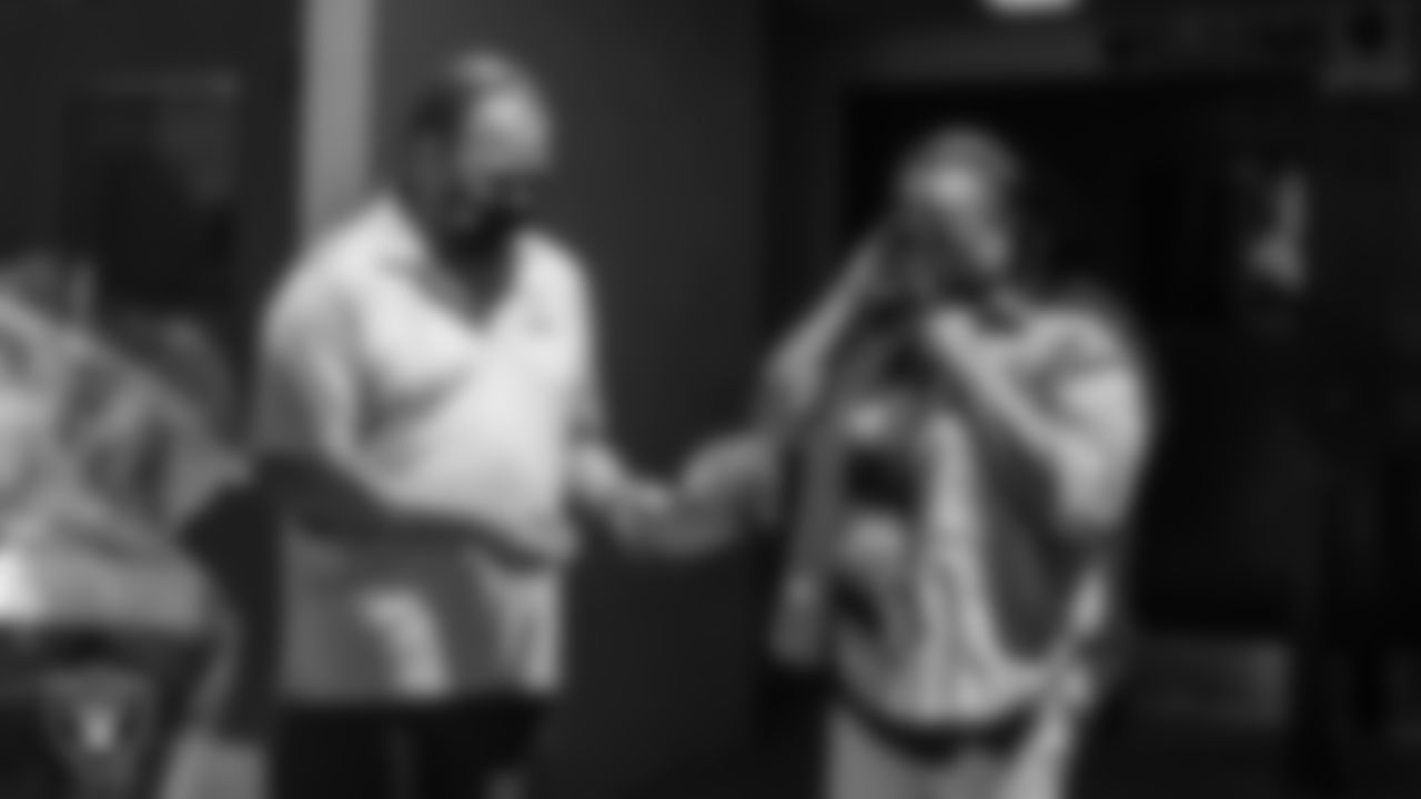 Las Vegas Raiders alumnus Keith Moody poses for a photo with Mario C. and Joanne Monaco Middle School teacher Mr. Redash after recognizing him for being a deserving teacher as part of the Raiders' Teacher Appreciation Week Blitz.