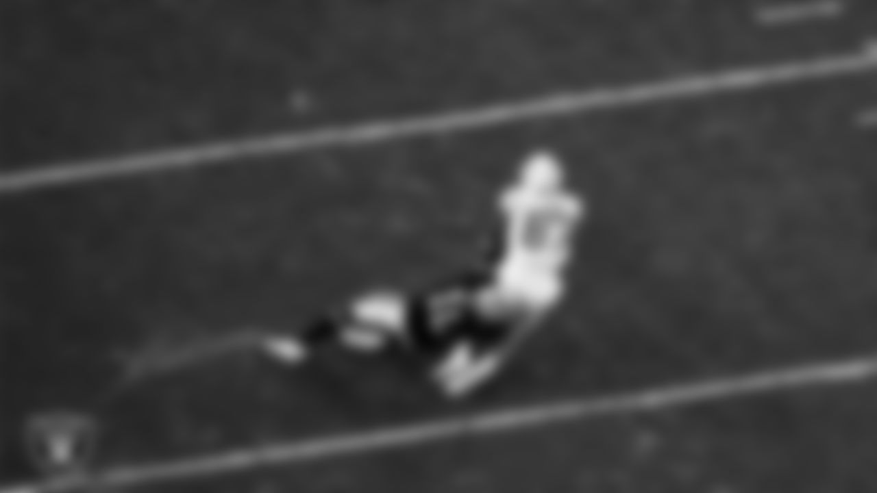 Las Vegas Raiders wide receiver Tyron Johnson (17) celebrates after forcing a fumble during the regular season home game against the Los Angeles Chargers.