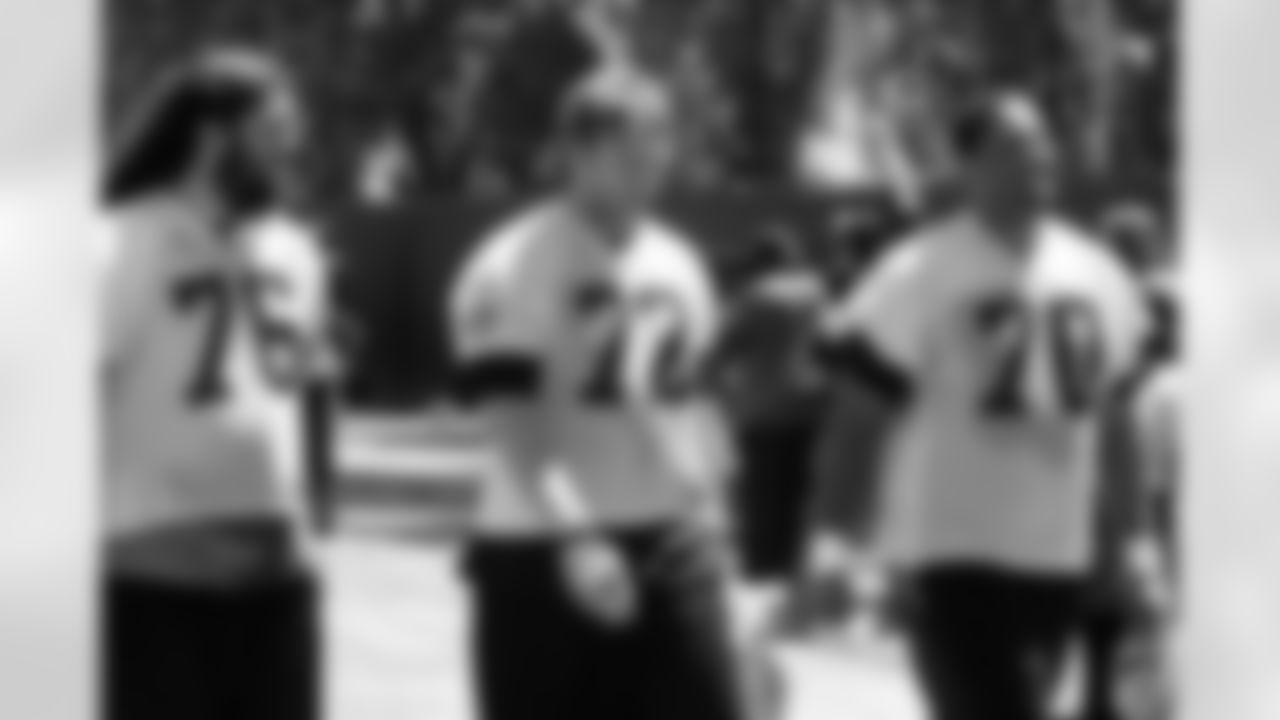 Offensive linemen Robert Gallery (76), Erik Pears (72) and Langston Walker head for the locker room. Photo by Tony Gonzales.