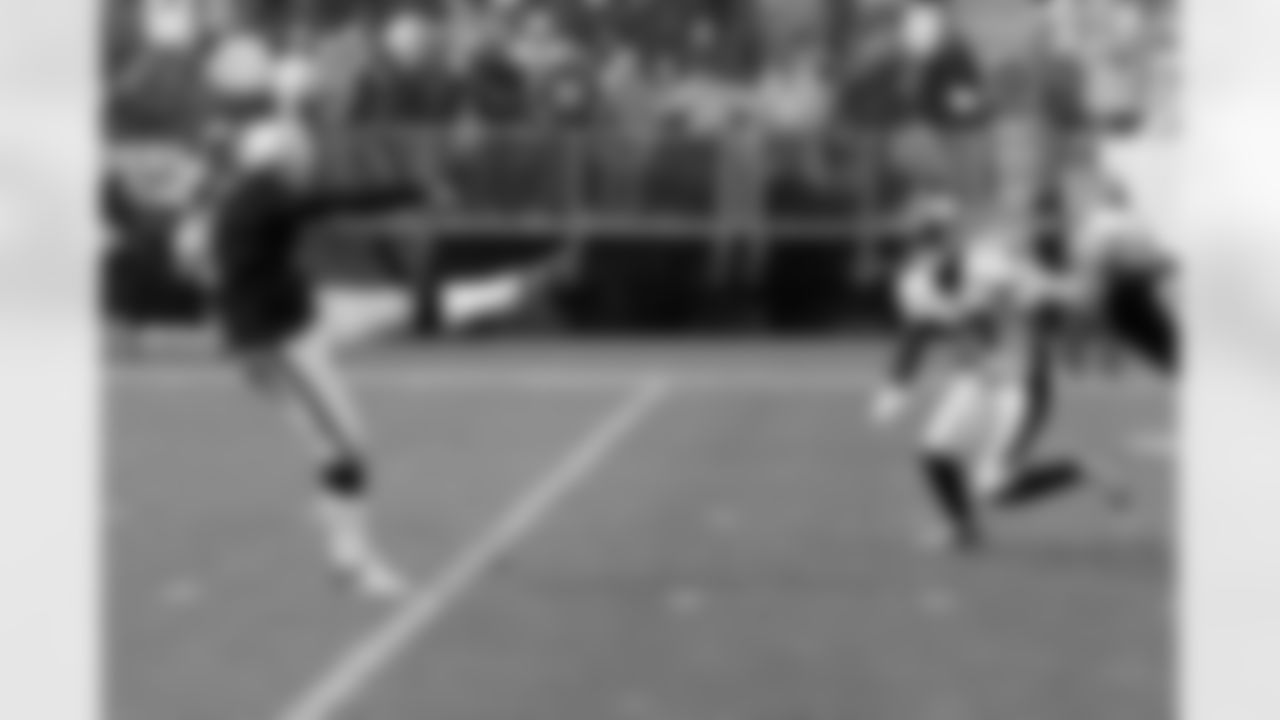 K Sebastian Janikowski kicks the first punt of his career. The punt was muffed by the Broncos and recovered by Raiders S Hiram Eugene. Photo by Tony Gonzales.