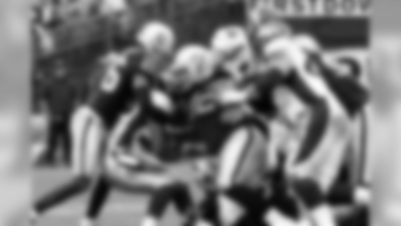 DT Tommy Kelly and DE Lamarr Houston make a defensive stop. Photo by Tony Gonzales.