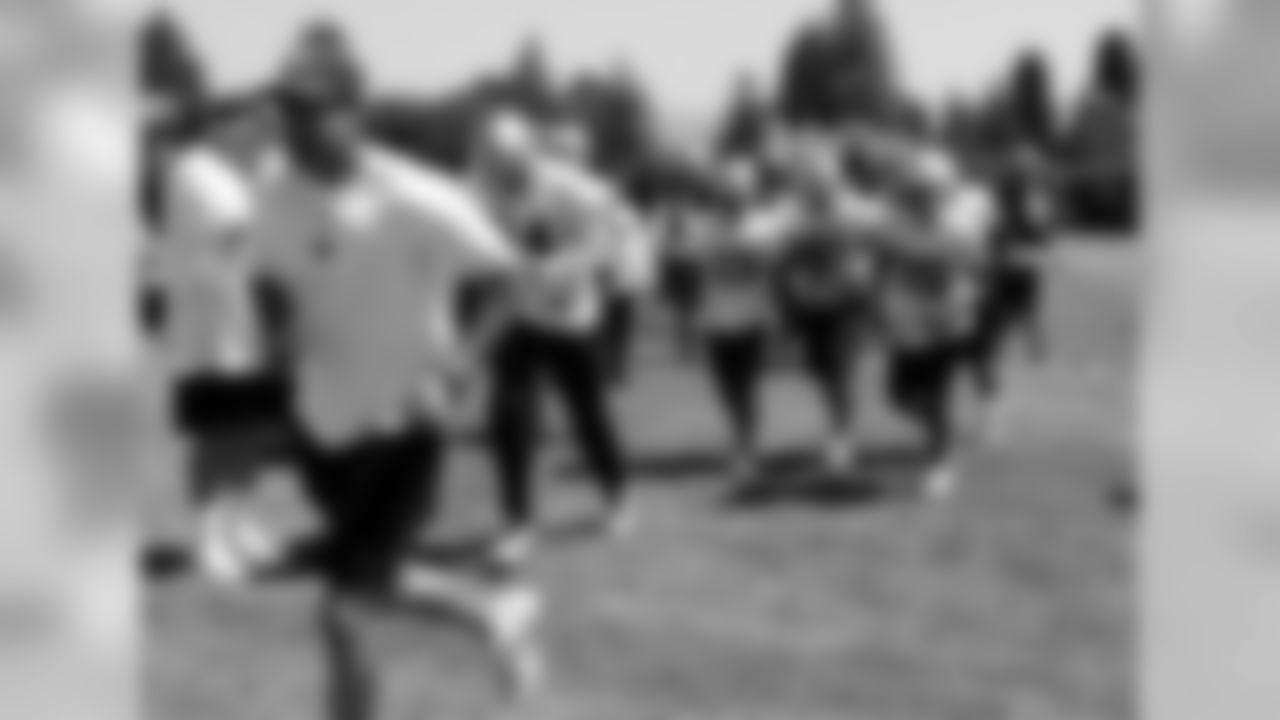 The DBs practice running out of the tunnel led by Hall of Famer Willie Brown.