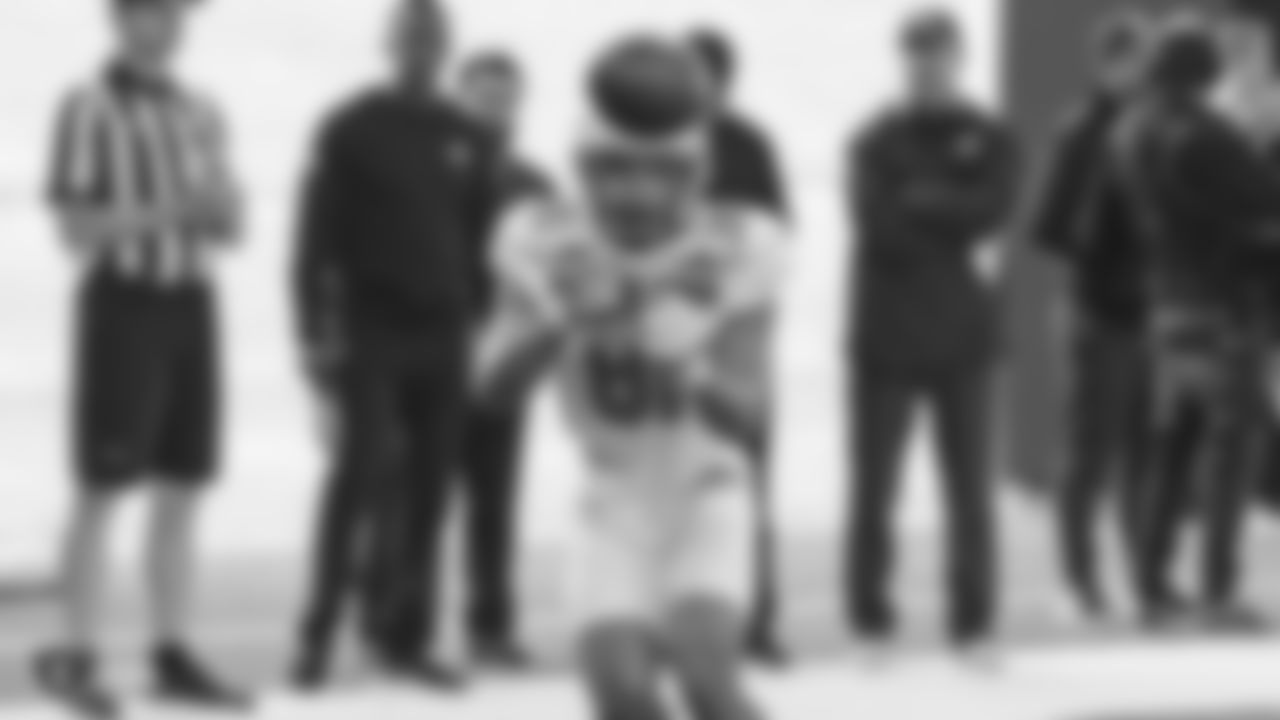 Massachusetts wide receiver Andy Isabella (5), Georgia State wide receiver Penny Hart (18), and Oakland Raiders head coach Jon Gruden at a practice on Day 2 of the 2019 Senior Bowl at South Alabama Jaguar Training Center, Wednesday, January 23, 2019, in Mobile, Alabama.