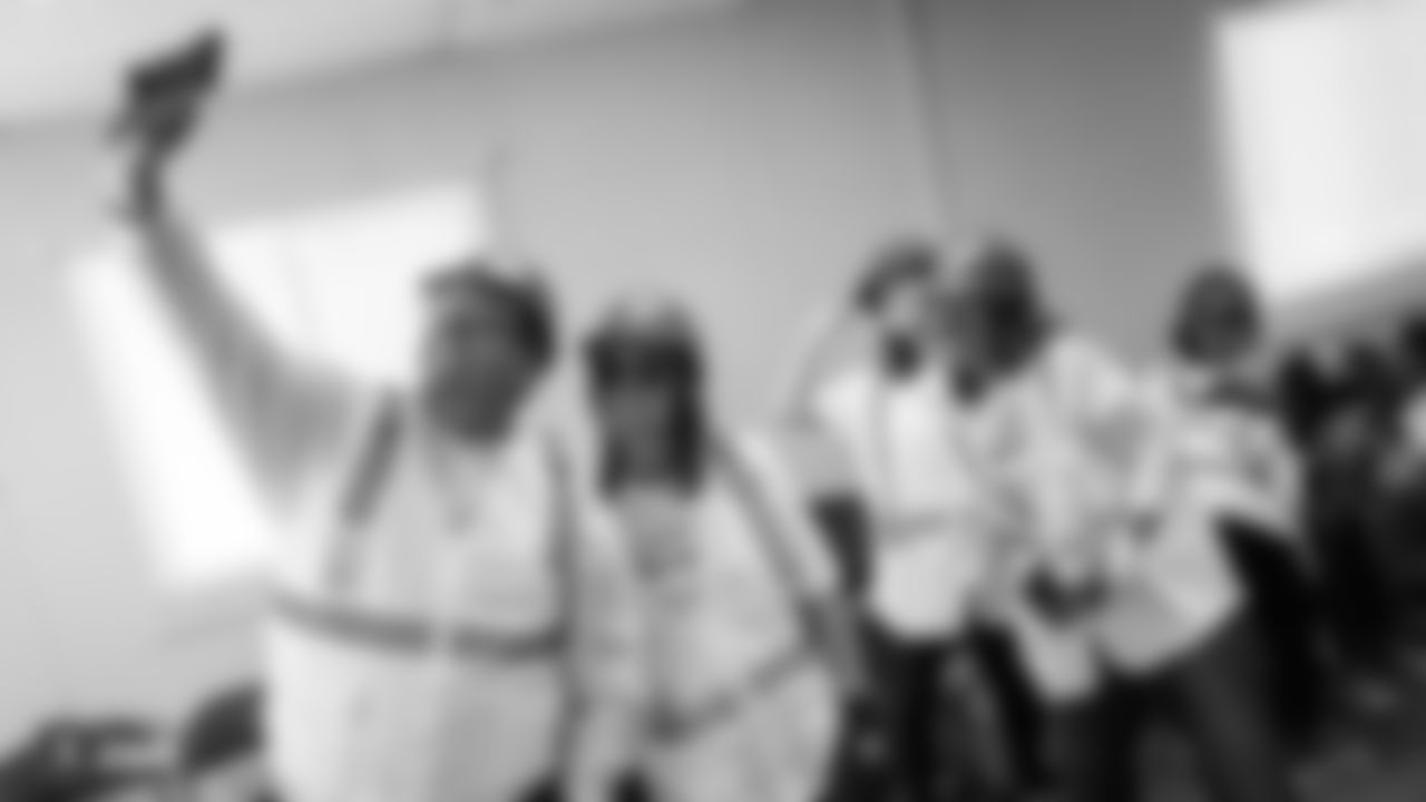 Safety equipment and Raiders gear awaits the kids from the Nate Mack Elementary School robotics team before they take a tour of Allegiant Stadium.
