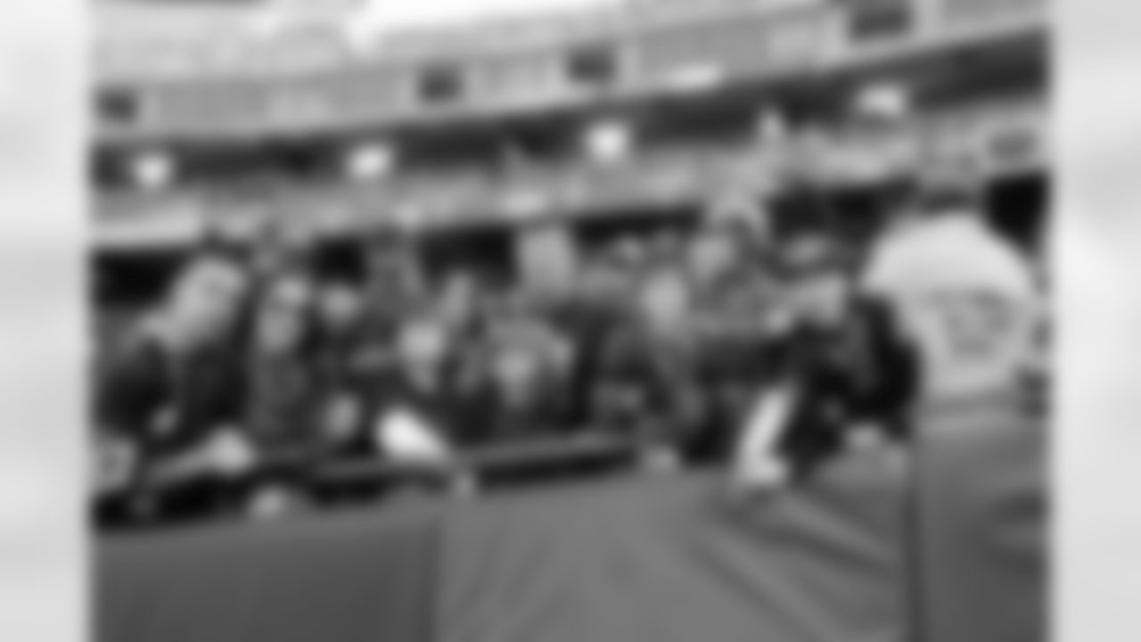 Former Raiders TE Tony Stewart signs an autograph for a young fan.