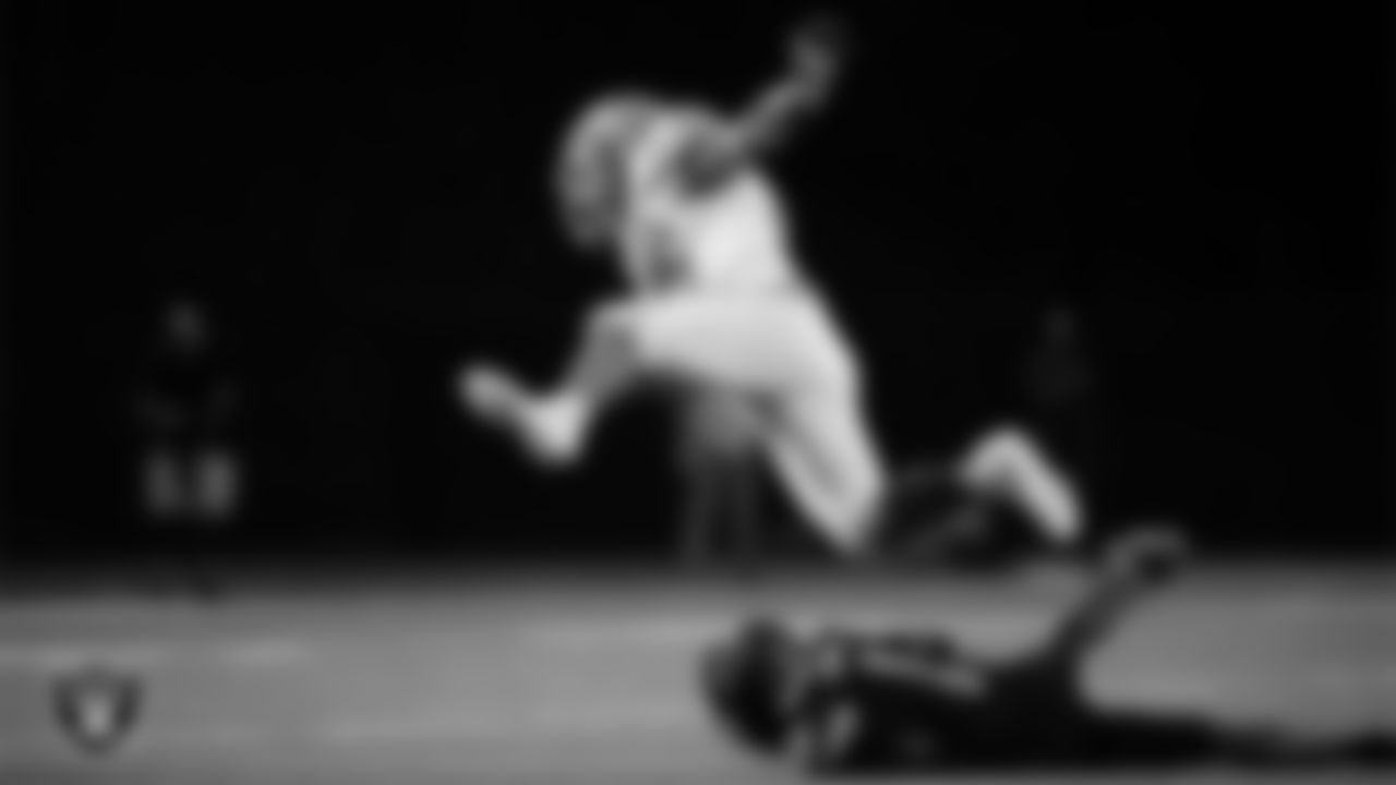 Las Vegas Raiders defensive tackle Jonah Laulu (96) during the coin toss before the Las Vegas Raiders' Football Showcase game between Centennial and Canyon Springs High School at Centennial High School.