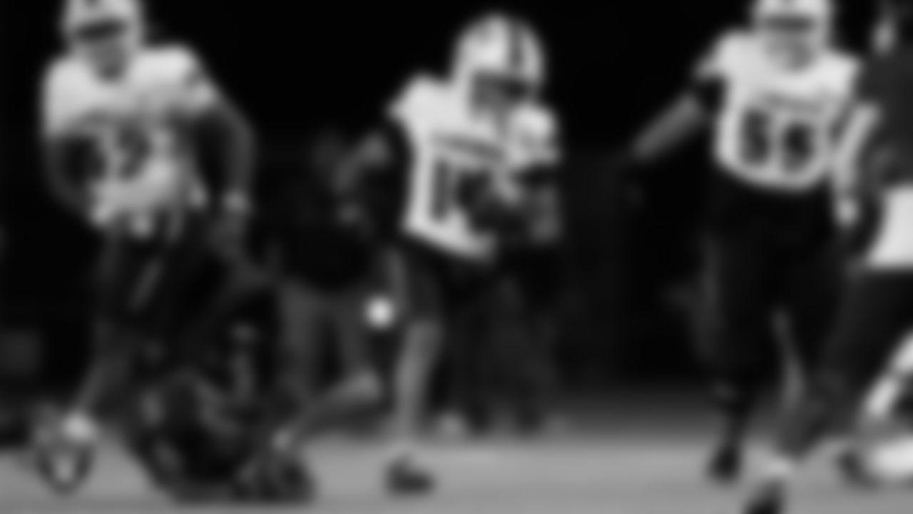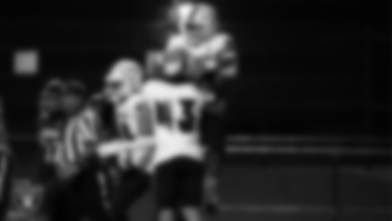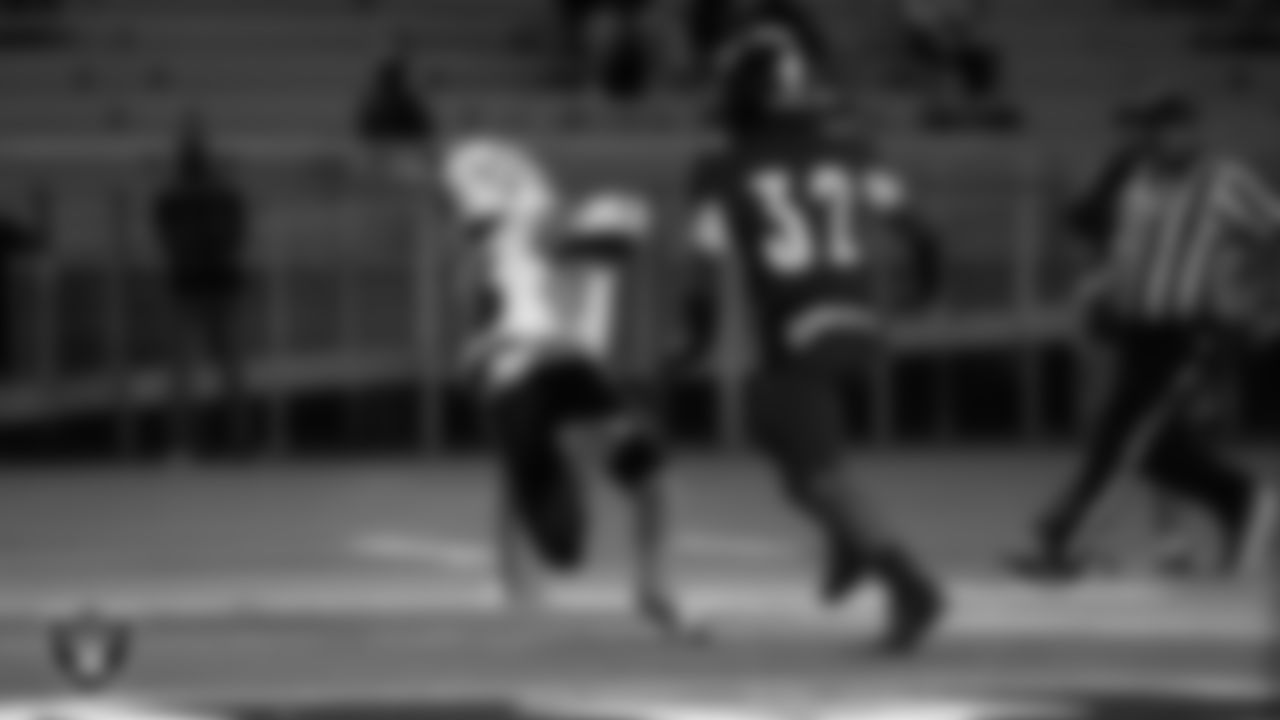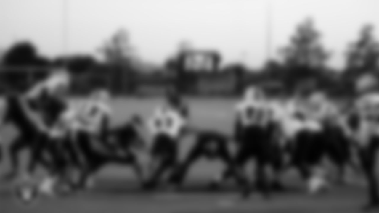Las Vegas Raiders alumnus Teyo Johnson during the coin toss before the Las Vegas Raiders' Football Showcase game between Desert Pines High School and Liberty High School at Desert Pines High School.