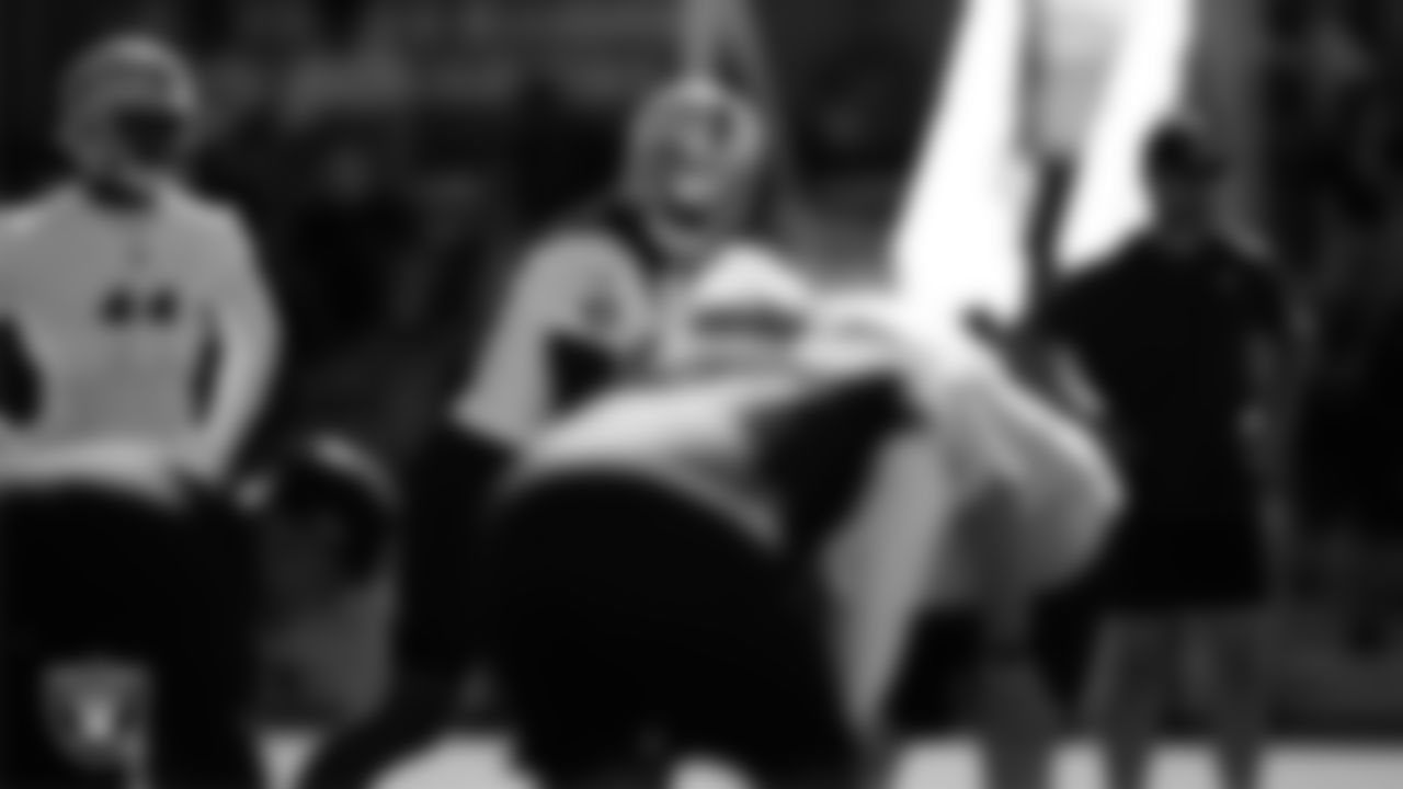 Las Vegas Raiders defensive line coach Rob Leonard and defensive linemen on the field for practice at 2023 Training Camp at Intermountain Health Performance Center.