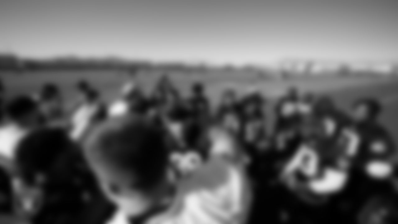 The Las Vegas Raiders huddle at a workout during phase two of the offseason program.