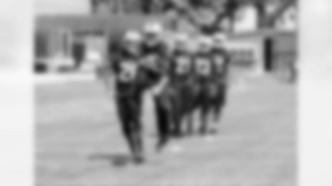 DB Brandian Ross, CB Mitchell White, and CB Taiwan Jones running drills.