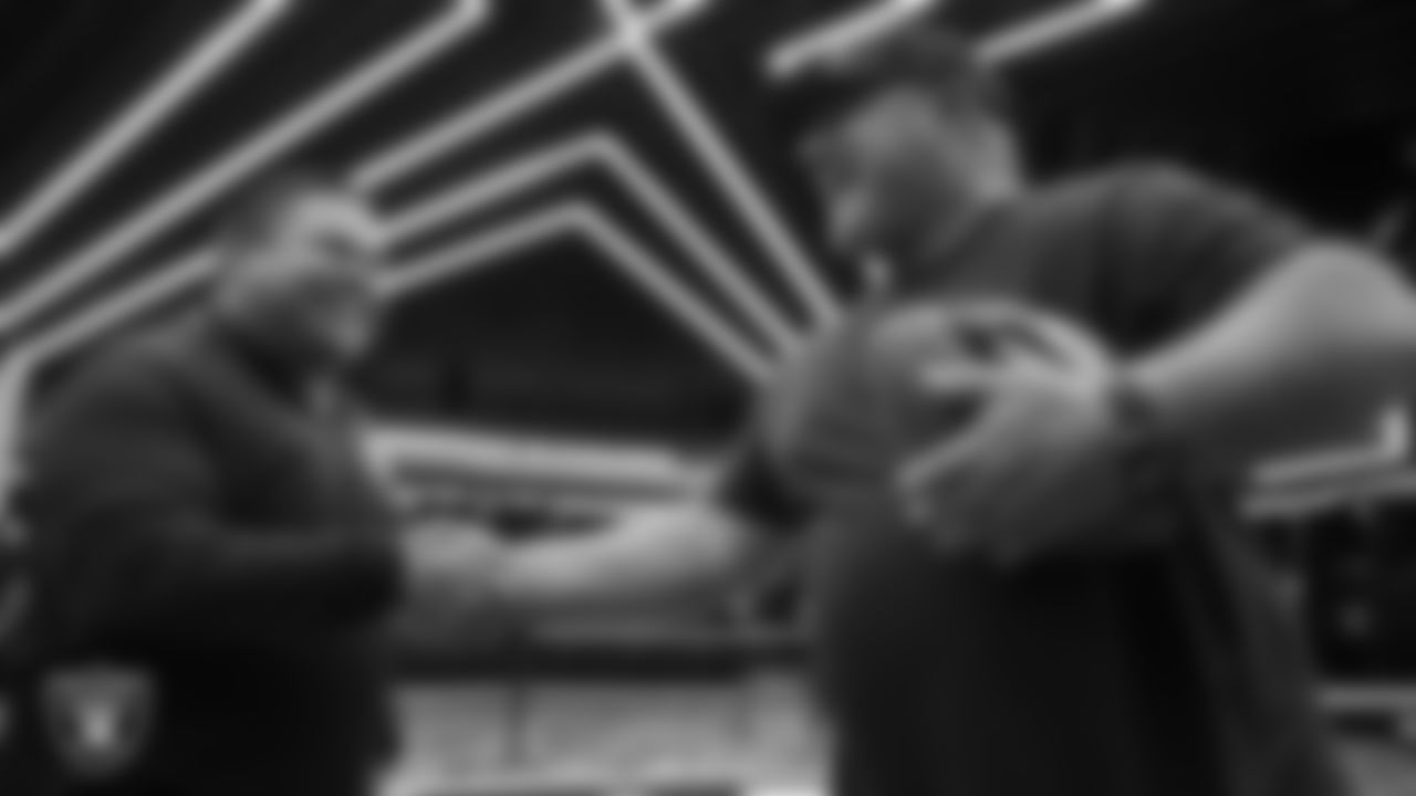 Sunrise Mountain High School football coach Christopher Sawyers is congratulated by Las Vegas Raiders manager of football development Jordan Aguilar after being named the Tom Flores Coach of the Year at Allegiant Stadium.