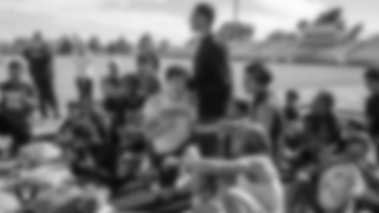 Las Vegas Raiders fullback Jakob Johnson (45) hands out equipment to members of the Eldorado High School football team.