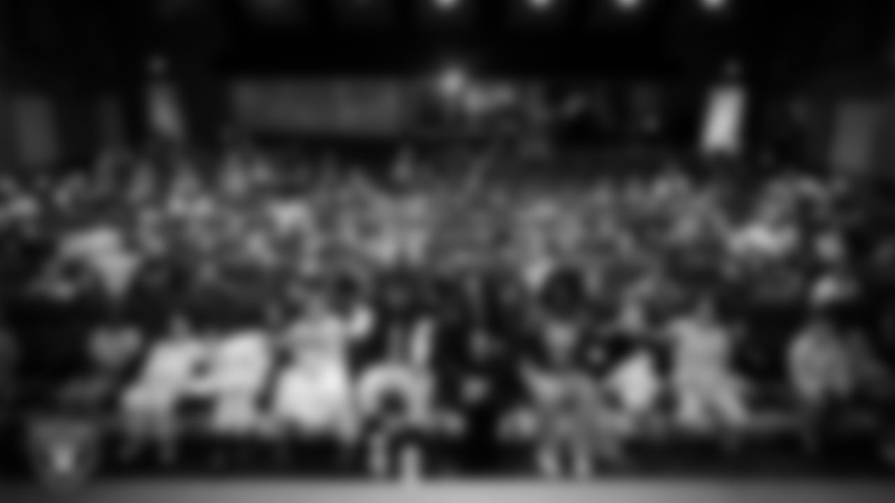 Raider Rusher and Las Vegas Raiders senior vice president and chief sales officer Qiava Martinez are introduced during story time at the Whitney Library.
