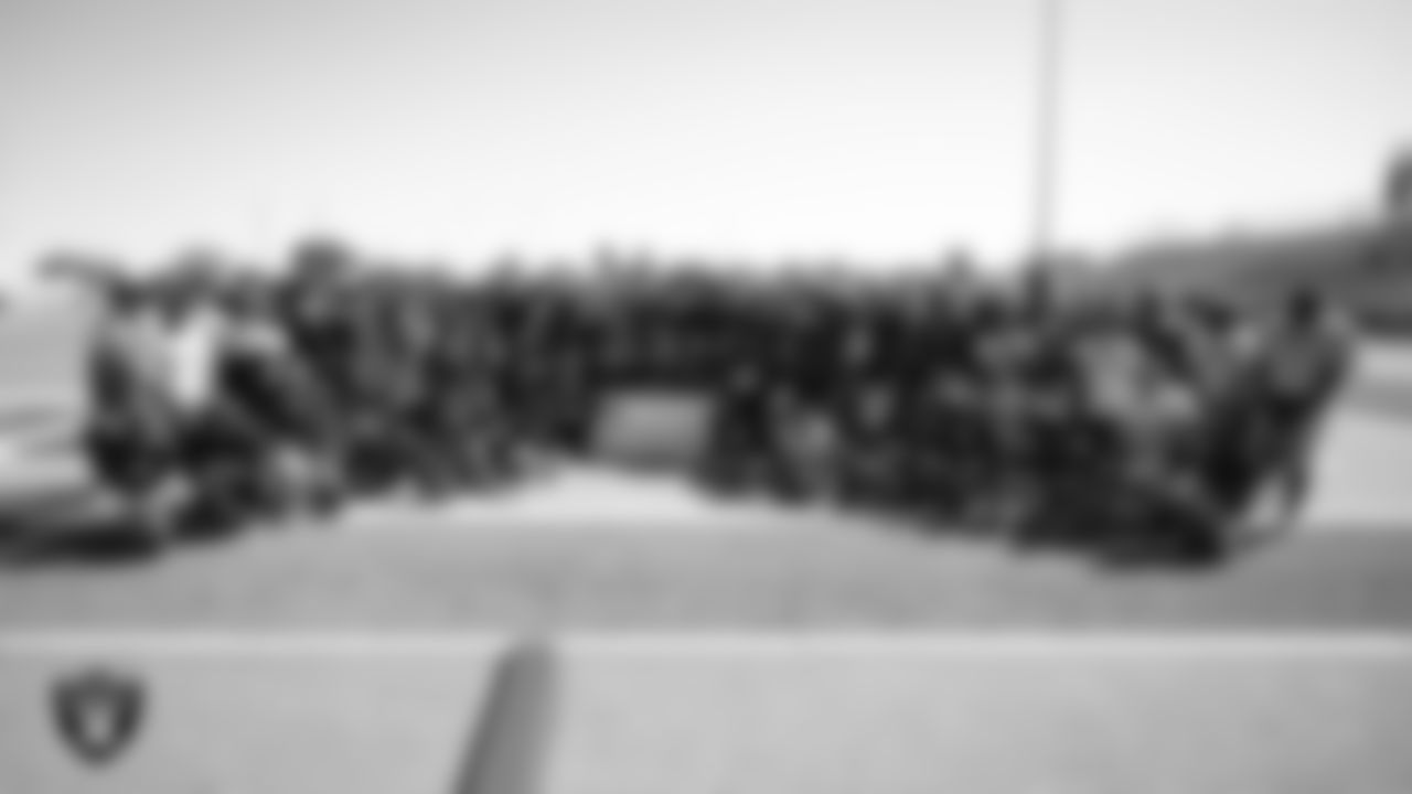 Las Vegas Raiders defensive end Charles Snowden (49) poses for a photo with the Shadow Ridge High School football team during practice at Shadow Ridge High School.