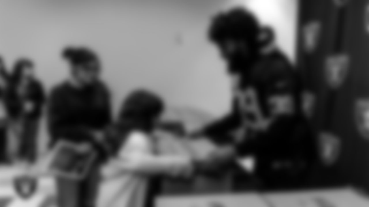 Las Vegas Raiders defensive end Tashawn Bower (96) signs an autograph for a community member during a Thanksgiving meal donation at the Pearson Community Center.