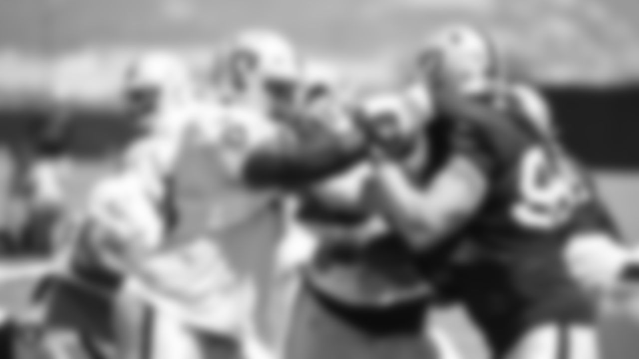 Raiders defensive tackle Ethan Westbrooks (63) and tackle Kolton Miller (74) on the field for a preseason practice.
