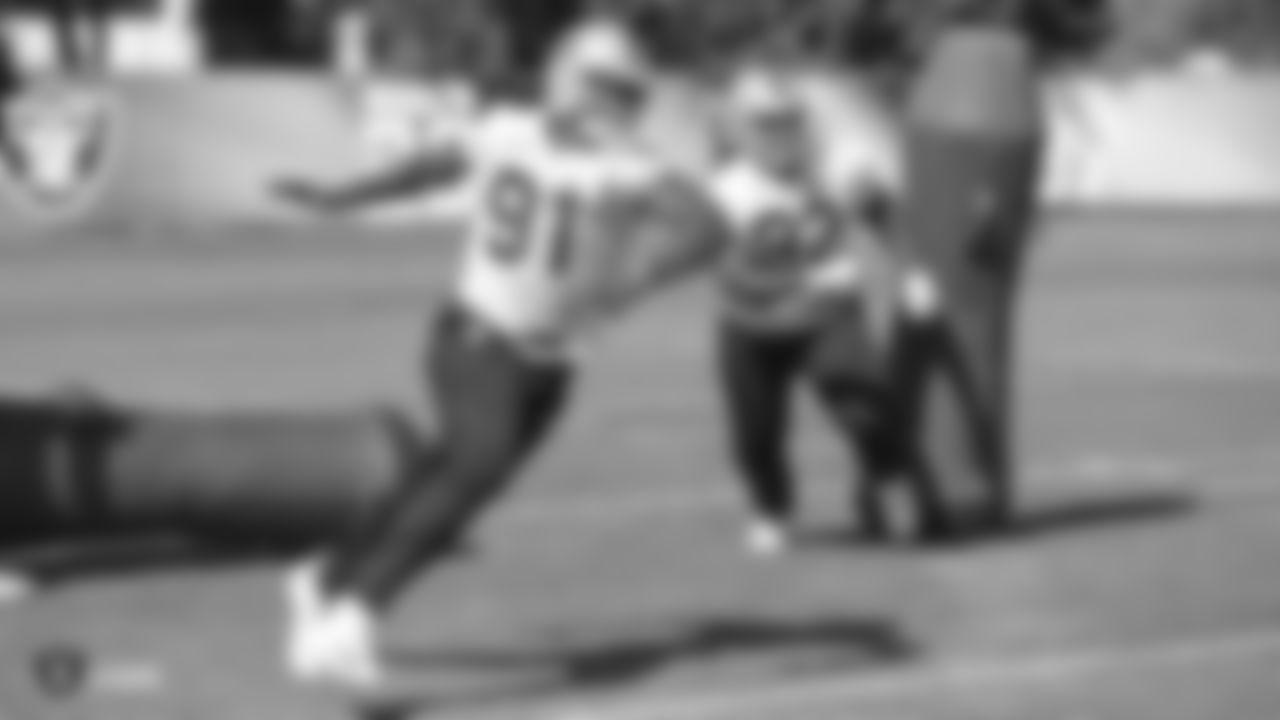 Oakland Raiders defensive end Arden Key (99) on the field for practice at the Oakland Raiders Practice Facility, Wednesday, October 10, 2018, in Alameda, California.