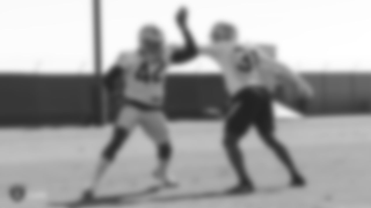Oakland Raiders linebacker Kyle Wilber (58) and offensive tackle Kolton Miller (77) on the field for practice at the Oakland Raiders Practice Facility, Wednesday, October 10, 2018, in Alameda, California.