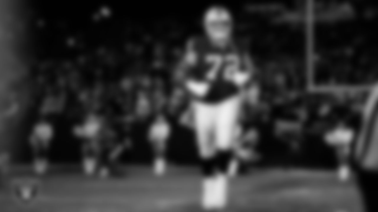 Las Vegas Raiders guard/tackle Jermaine Eluemunor (72) is introduced onto the field before the regular season home game against the New York Jets at Allegiant Stadium.