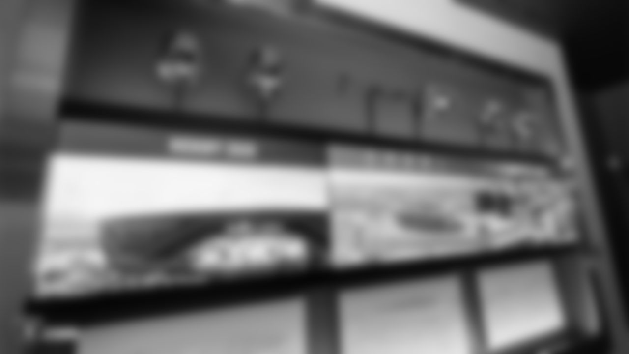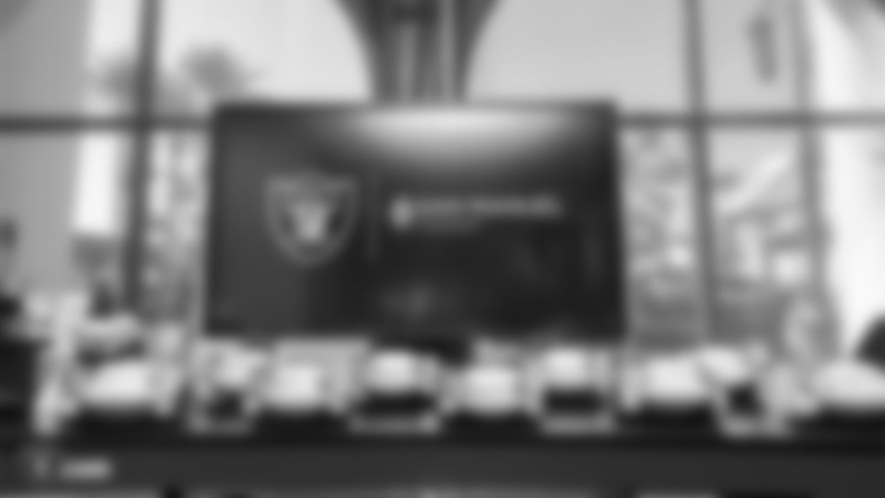 A display with the Raiders and San Manuel Casino's logo commemorates San Manuel Band of Mission Indians' new partnership with Allegiant Stadium and the Raiders at private event.