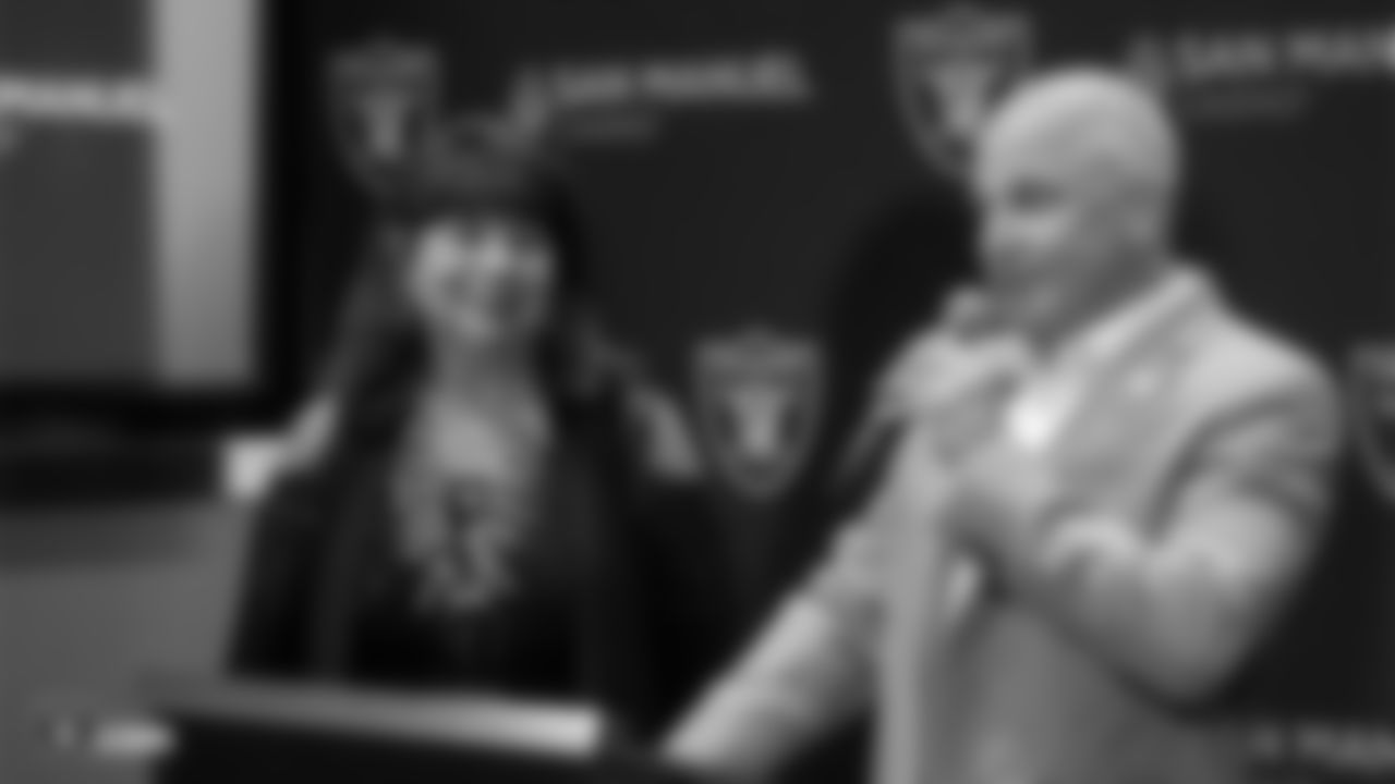 Raiders President Marc Badain speaks alongside San Manuel Band of Indian Mission Chairwoman Lynn Valbuena at a private event celebrating San Manuel Band of Mission Indians' new partnership with Allegiant Stadium and the Raiders.