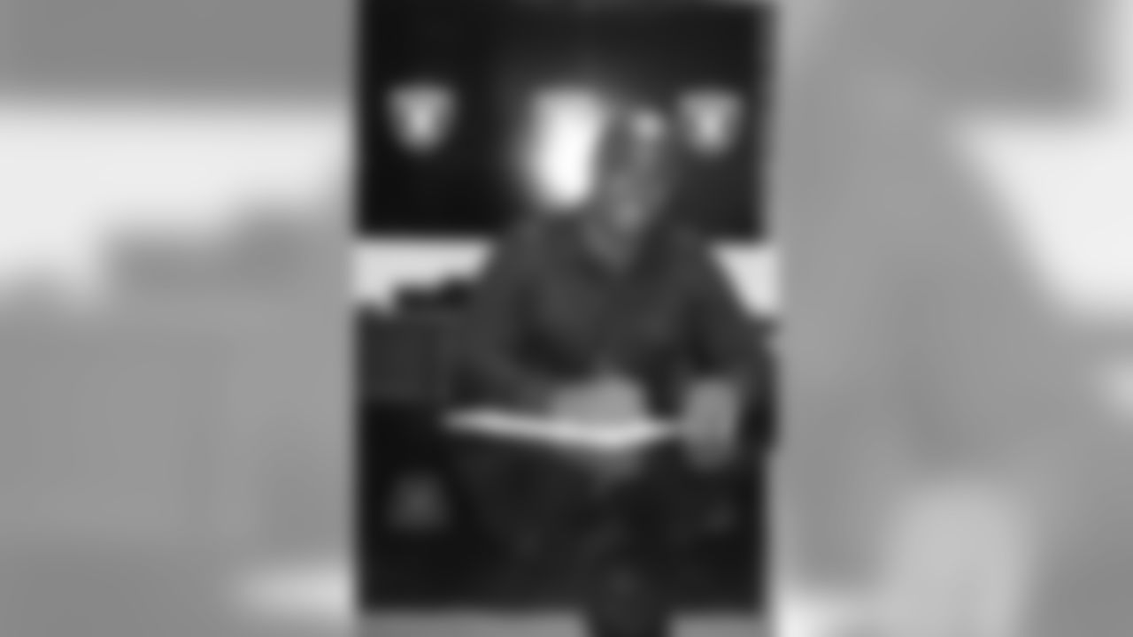 New Raiders DE Justin Tuck signs his contract in the Hall of Fame room at the Raiders facility.