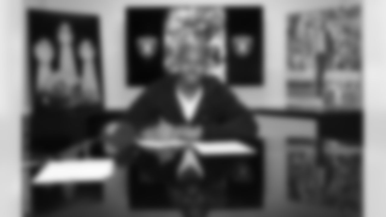 Defensive lineman Antonio Smith is all smiles in the Raiders Hall of Fame room.