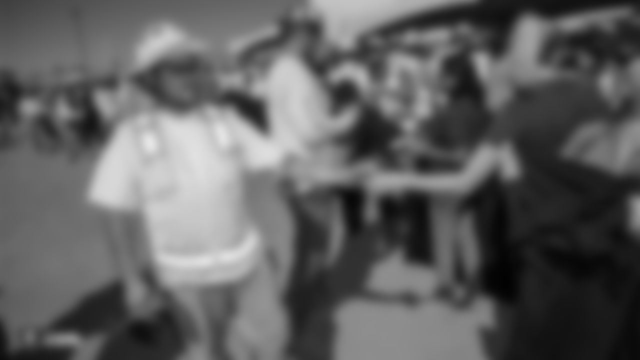 Raiders Owner Mark Davis and President Marc Badain, along with Raiders' front office staff, show appreciation to the construction workers of Allegiant Stadium by serving lunch and spending time with them at the construction site.