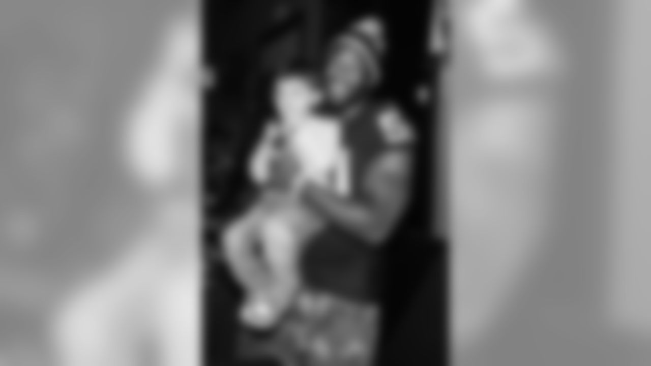 LB Aaron Curry takes a photo with a young fan.