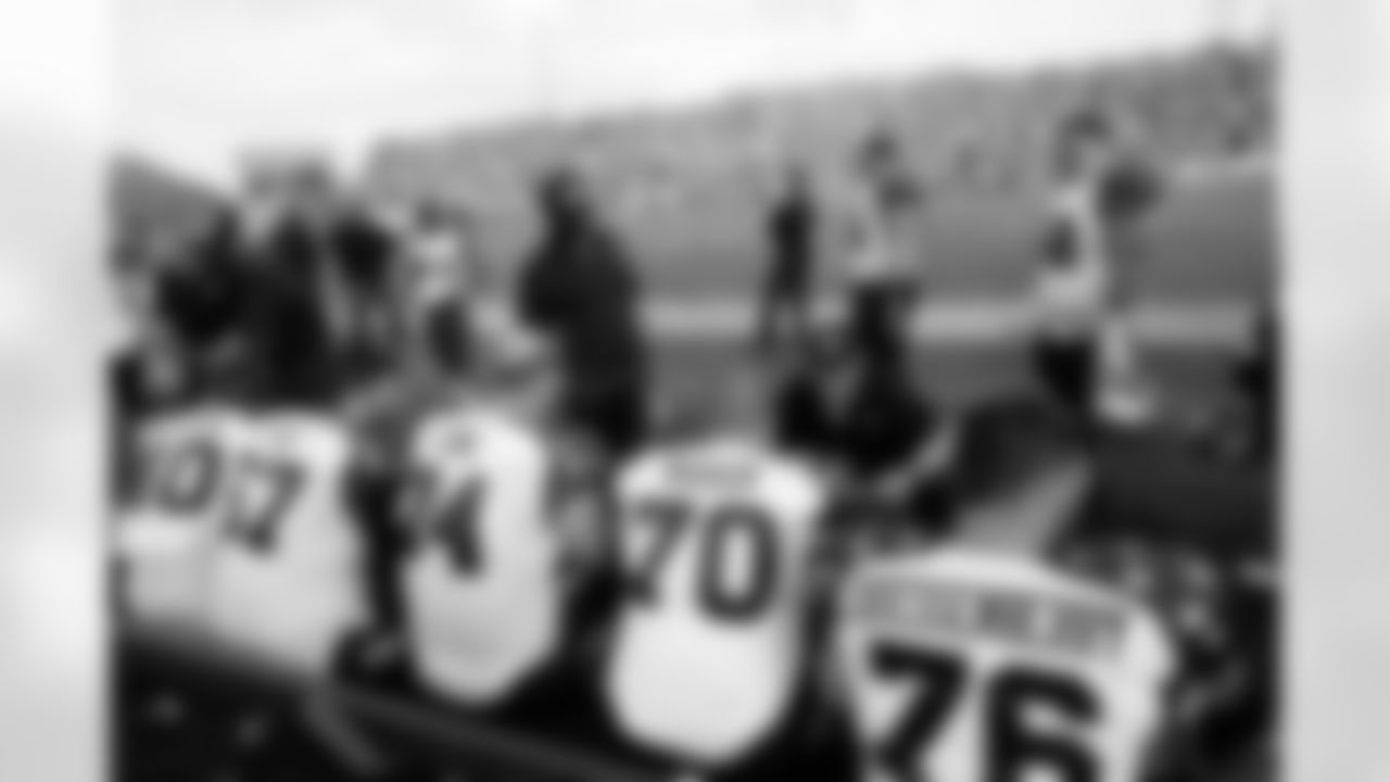 The offensive line goes through pregame warmup drills.