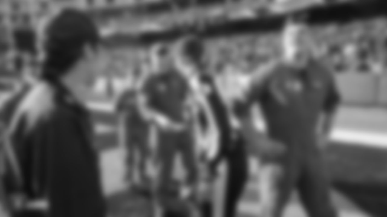 Oakland Raiders alumni, Mervyn Fernandez, Lester Hayes, and George Atkinson, with Oakland Raiders head coach Jon Gruden before the Oakland Raiders regular season game against the Pittsburgh Steelers at Oakland-Alameda County Coliseum, Sunday, December 9, 2018, in Oakland, California. The Oakland Raiders won 24-21.