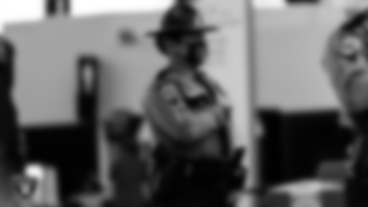 A member of the Nevada Highway Patrol during the national anthem before the Las Vegas Raiders regular season home game against the Indianapolis Colts.