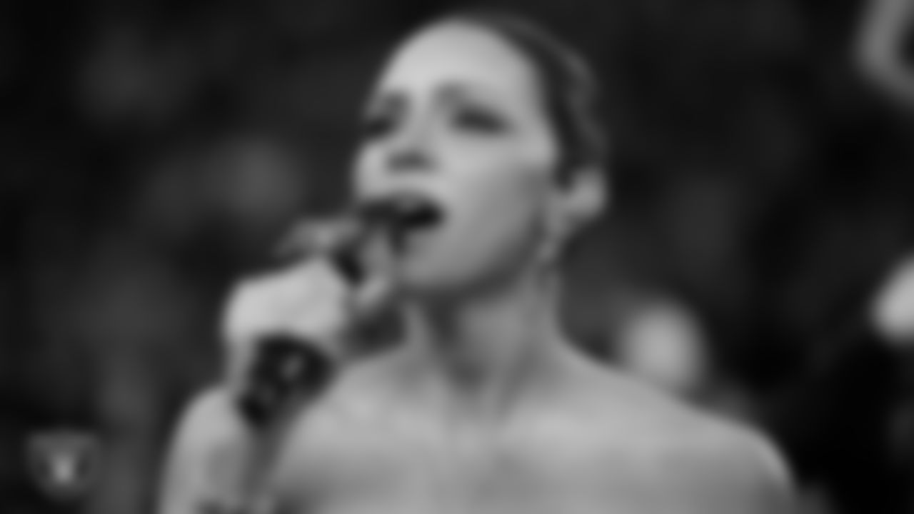 Singer Katharine McPhee performs the national anthem before the Las Vegas Raiders' regular season home game against the Denver Broncos at Allegiant Stadium.