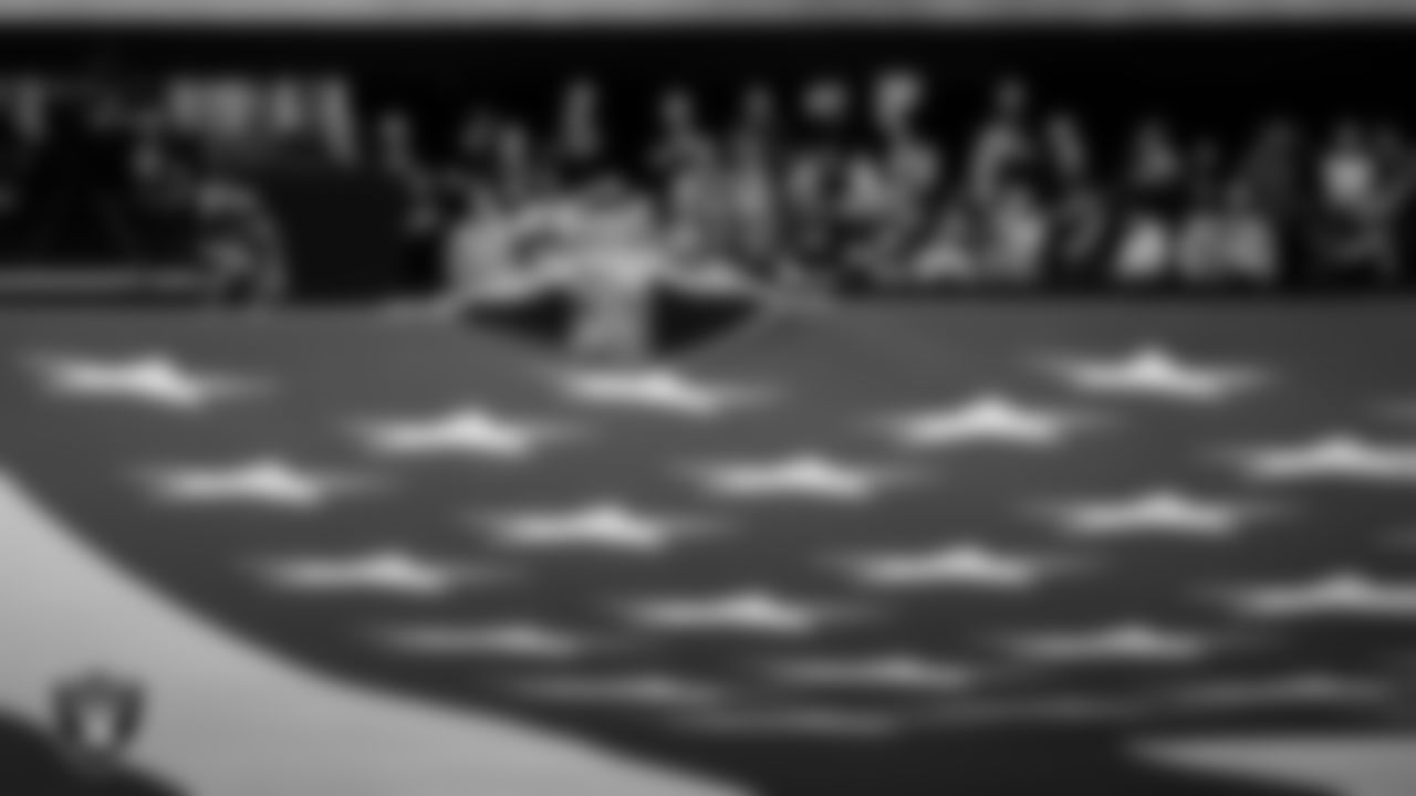 The Las Vegas Raiders during the national anthem before the Raiders' regular season home game against the Miami Dolphins.