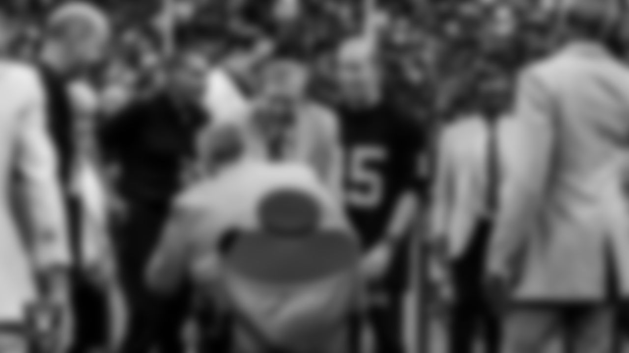 Las Vegas Raiders alumnus Jim Plunkett presents Raiders legend and Hall of Famer, Tom Flores with the Ring of Excellence during halftime at the Raiders' regular season home game against the Miami Dolphins.