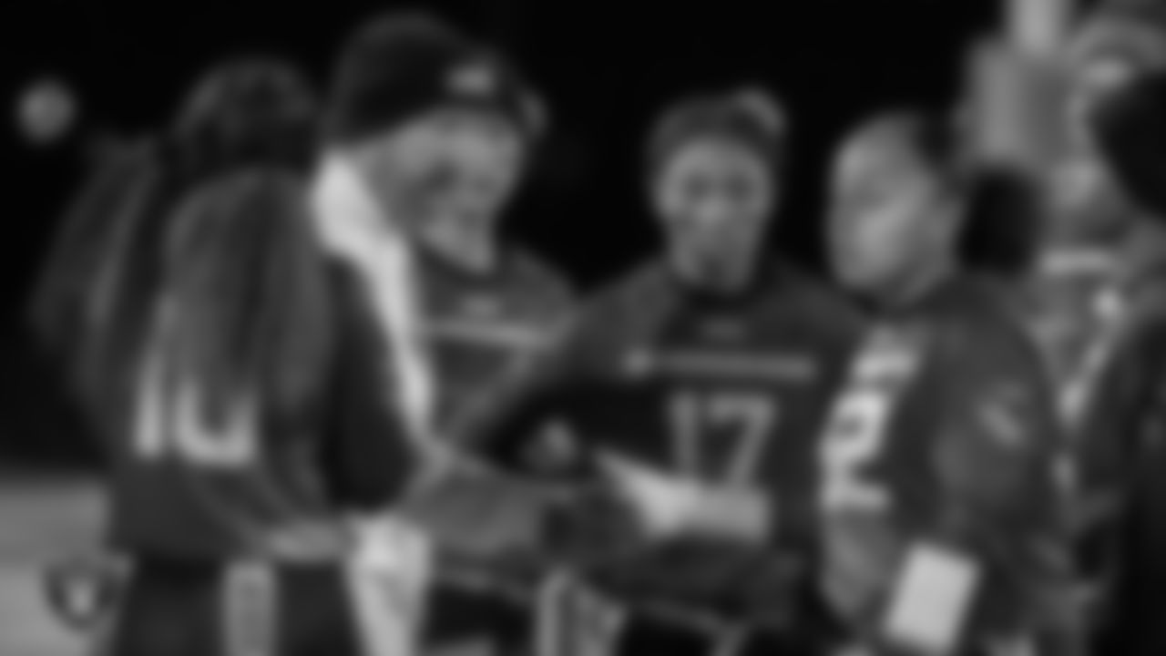 Raiders alumnus James Harris visited the Desert Oasis High School's girls flag football team to present coach Todd Thomson with the Tom Flores High School Coach of the Week award before their game.