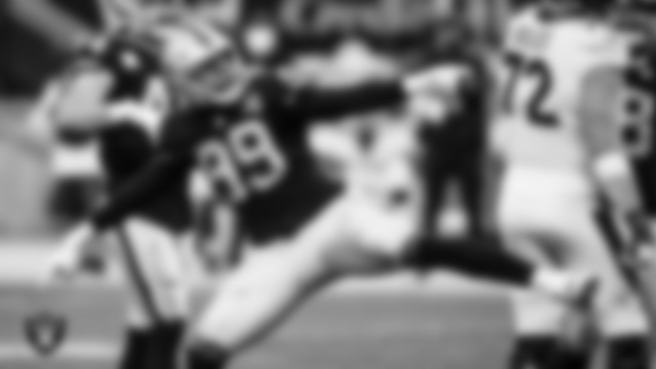 Las Vegas Raiders defensive end Kendal Vickers (91) celebrates after sacking the quarterback during the regular season home game against the Los Angeles Chargers.