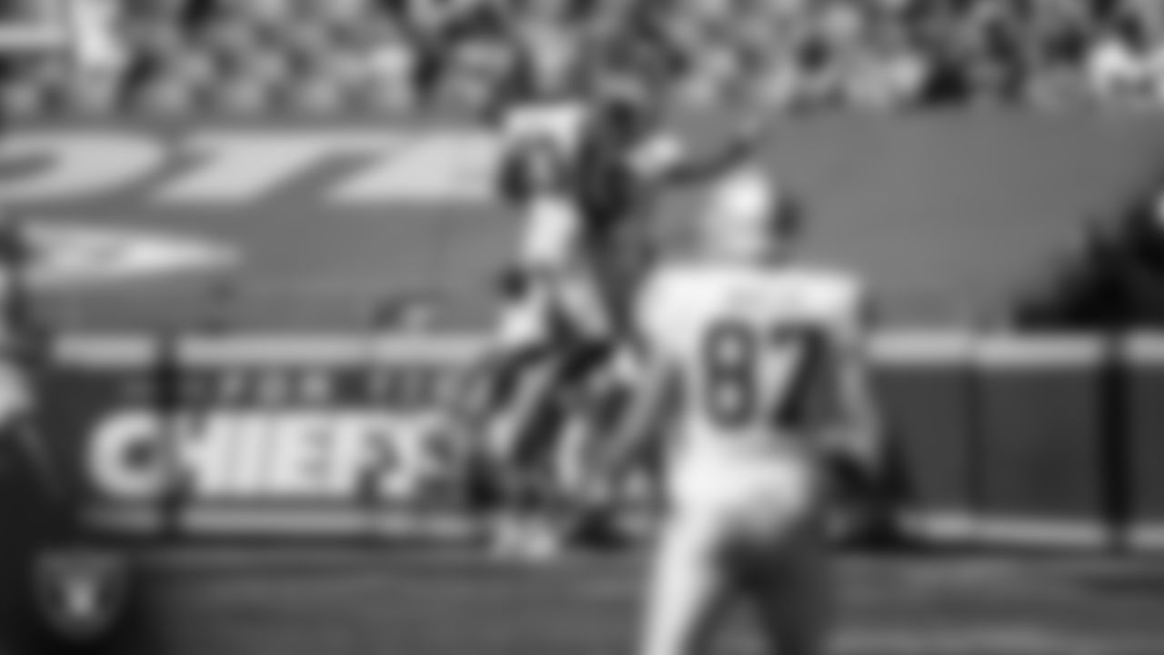 Las Vegas Raiders safety Jeff Heath (38) celebrates on the sidelines after intercepting a pass during the regular season away game against the Kansas City Chiefs.