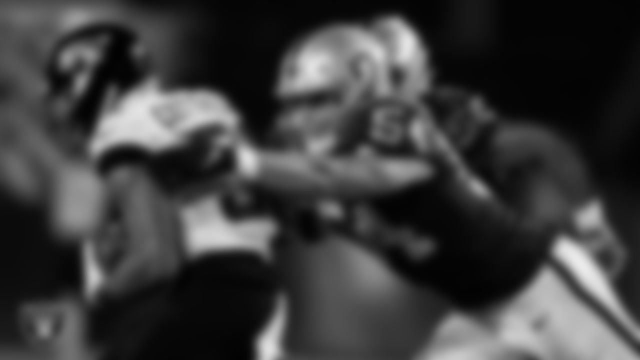 Las Vegas Raiders defensive end Tashawn Bower (96) makes a tackle during the Hall of Fame Game against the Jacksonville Jaguars at Tom Benson Hall of Fame Stadium.