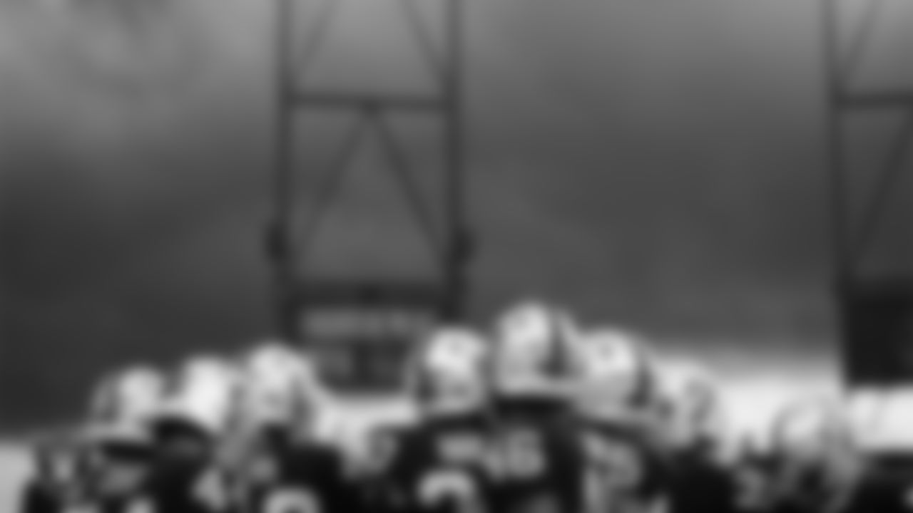 The Las Vegas Raiders huddle in the tunnel before the Hall of Fame Game against the Jacksonville Jaguars at Tom Benson Hall of Fame Stadium.