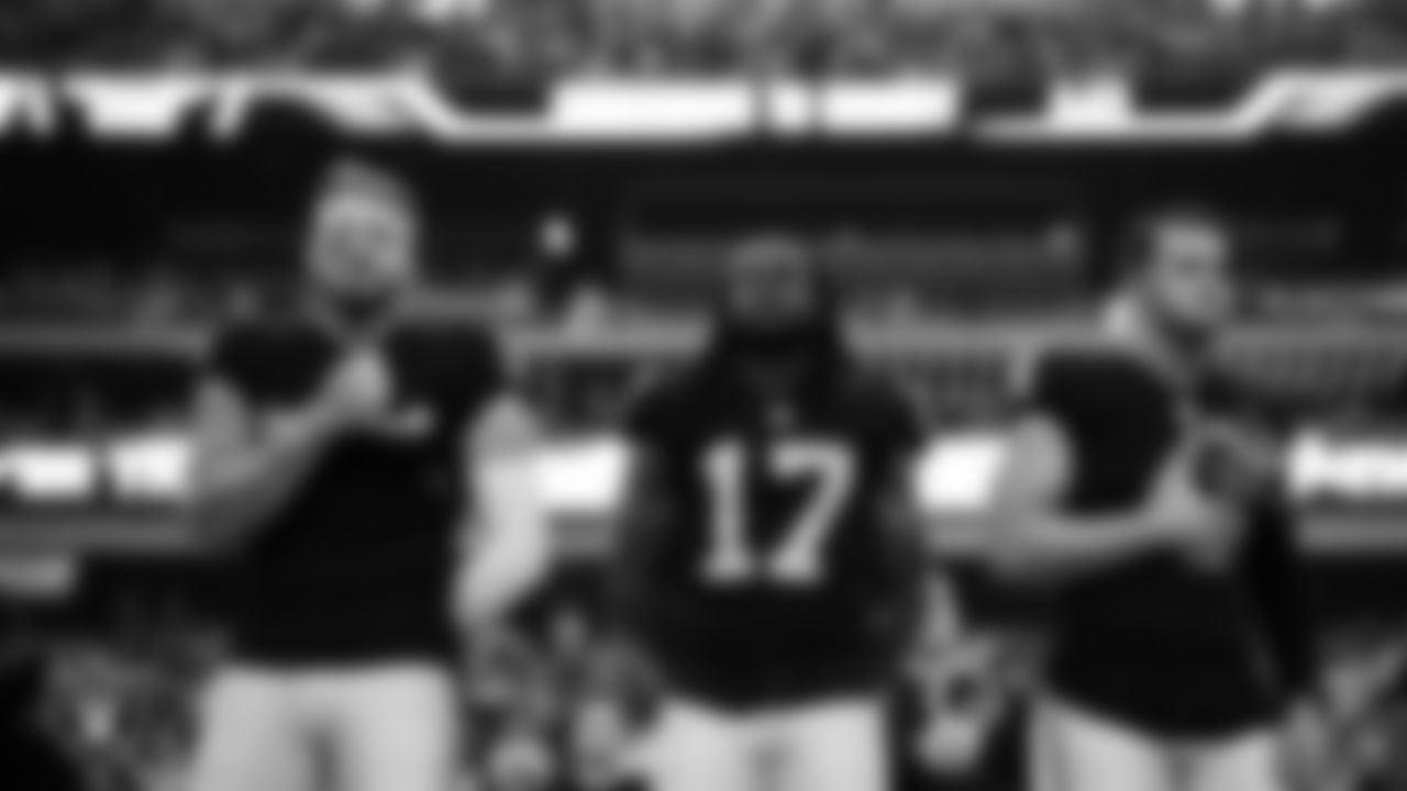 Las Vegas Raiders defensive end Maxx Crosby (98), wide receiver Davante Adams (17) and quarterback Derek Carr (4) during the national anthem before the preseason home game against the New England Patriots at Allegiant Stadium.
