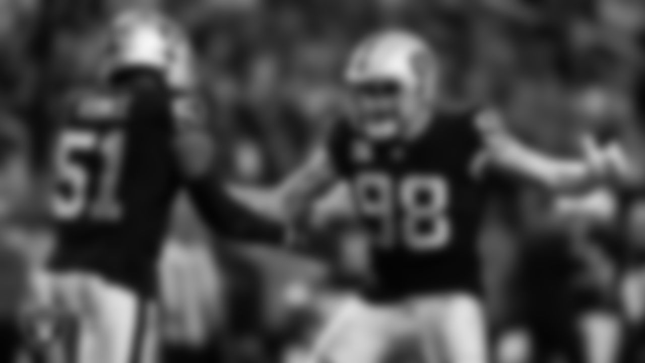 Las Vegas Raiders defensive end Maxx Crosby (98) celebrates with defensive lineman Adam Butler (69) after sacking the quarterback during the regular season away game against the Los Angeles Chargers at SoFi Stadium.