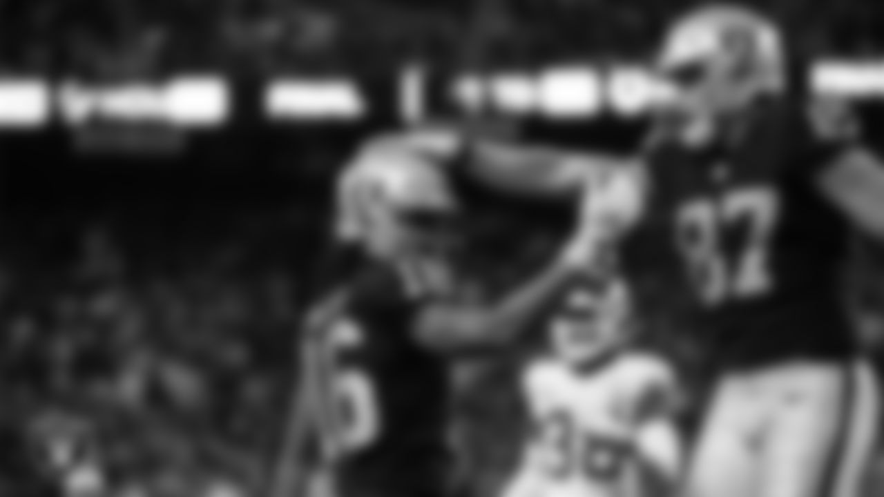 Las Vegas Raiders defensive lineman Jerry Tillery (90) celebrates with defensive end Malcolm Koonce (51) after sacking the quarterback during the regular season home game against the Los Angeles Chargers at Allegiant Stadium.