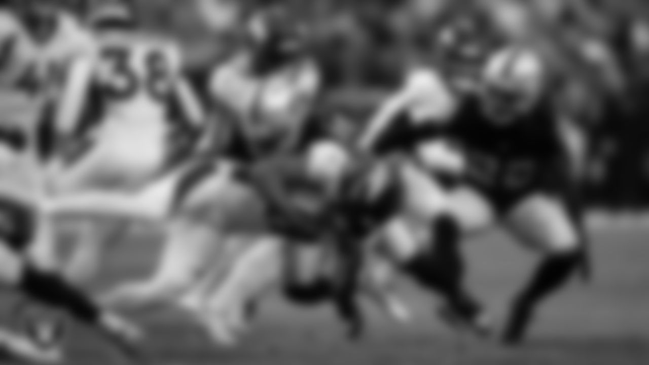 Las Vegas Raiders linebacker Curtis Bolton (36) and safety Isaiah Pola-Mao (20) make a tackle during the regular season home game against the Denver Broncos at Allegiant Stadium.