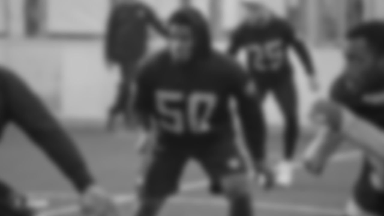 Oakland Raiders linebacker Nicholas Morrow (50) on the field for a walk through at Bladium Sports & Fitness, Thursday, November 15, 2018, in Alameda, California.
