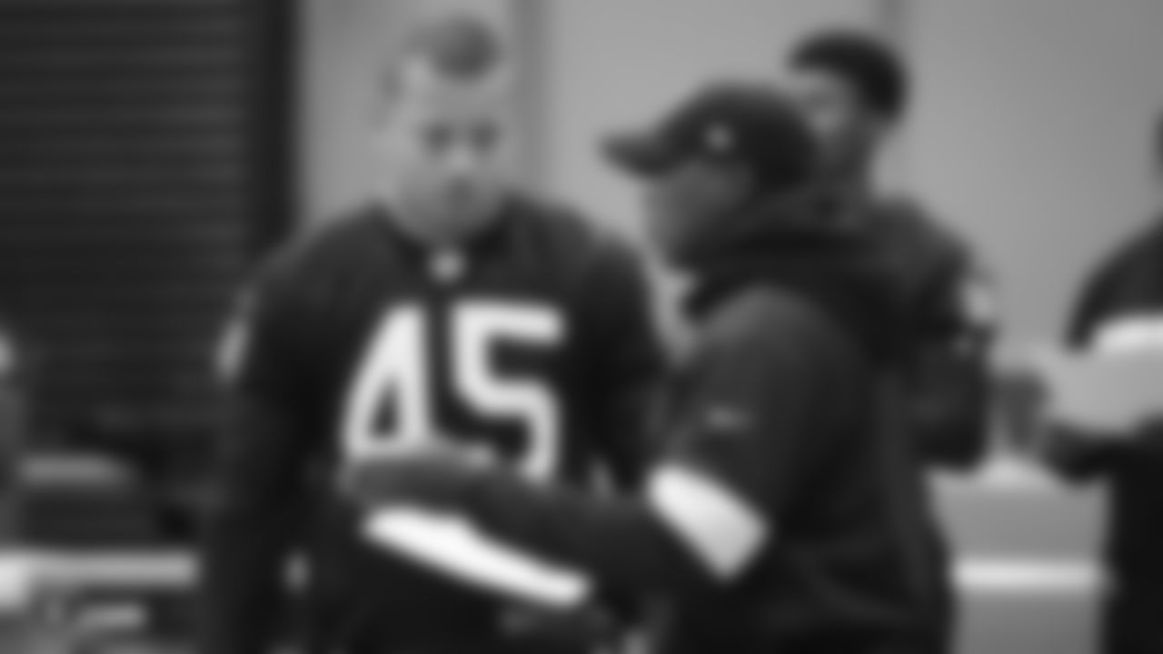 Raiders fullback Alec Ingold (45) talks with running backs coach Kirby Wilson during a walkthrough.