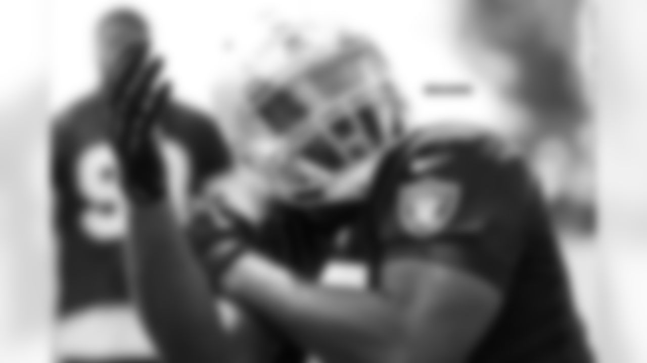DE Shelby Harris gets coached up by defensive line coach Terrell Williams.